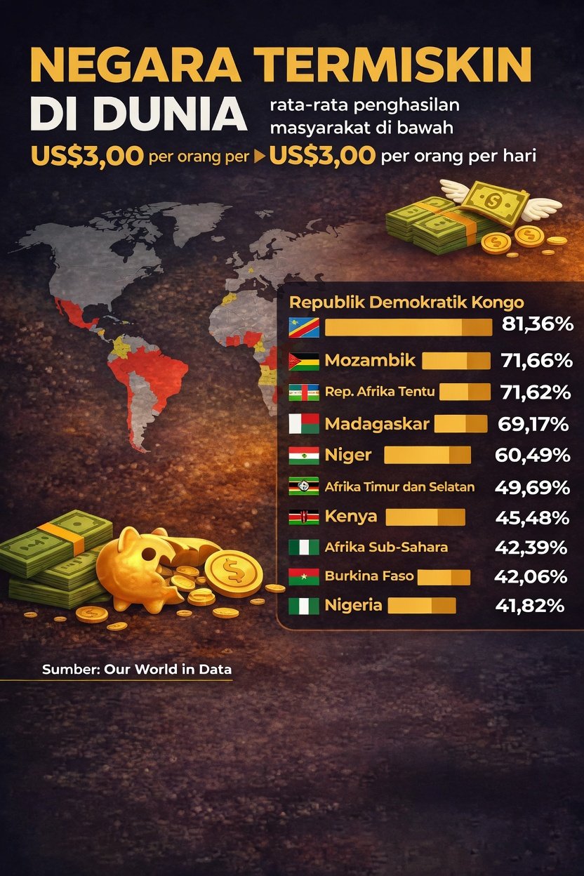 Ada begitu banyak negara yang masuk dalam kategori kemiskinan ekstrem dengan rata-rata pendapatan masyarakat di bawah US$3,00 atau Rp51.490 per hari.
