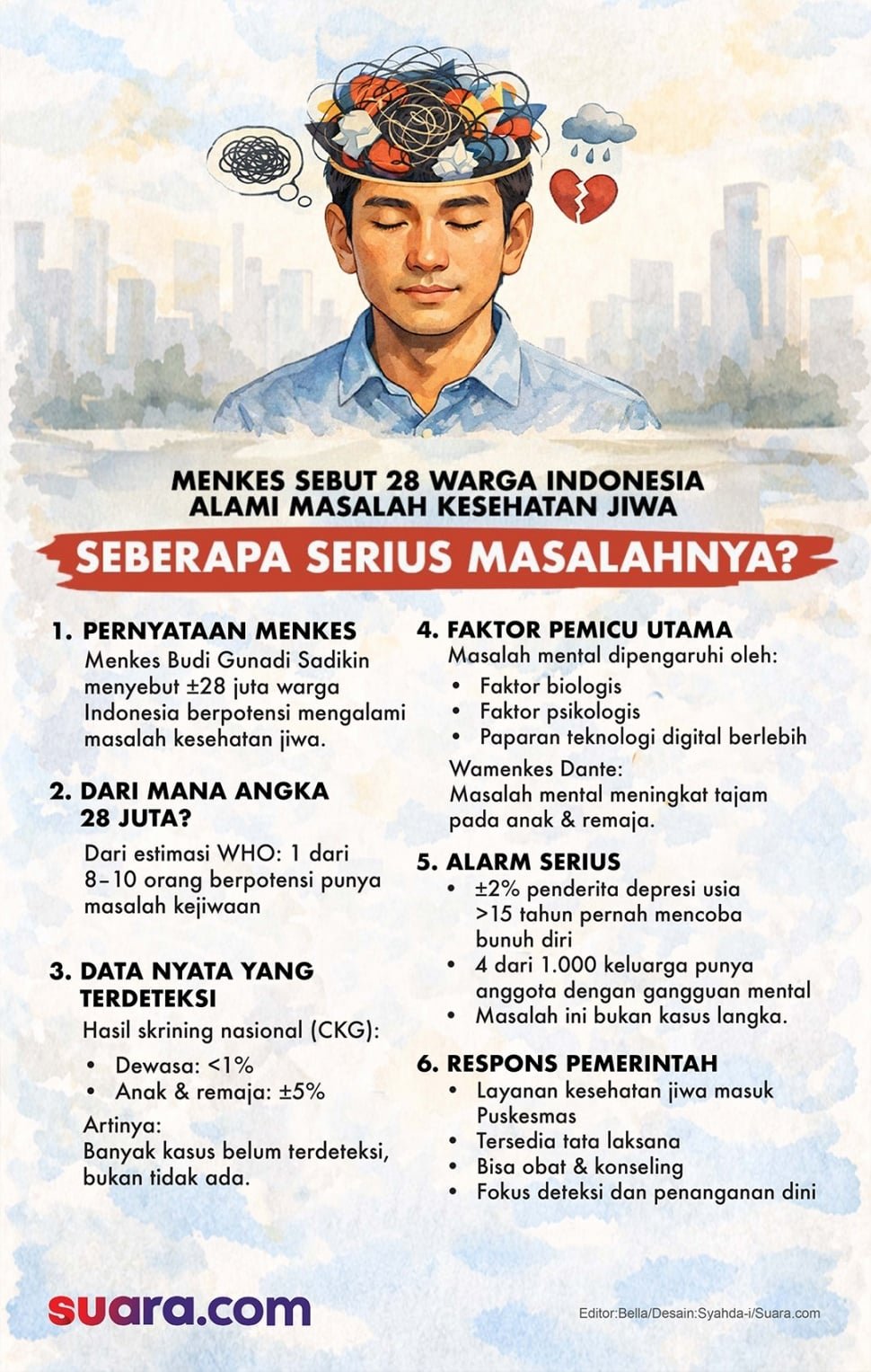 Ia mengungkap estimasi yang selama ini luput dari sorotan publik, yakni sekitar 28 juta warga Indonesia berpotensi mengalami masalah kesehatan jiwa.