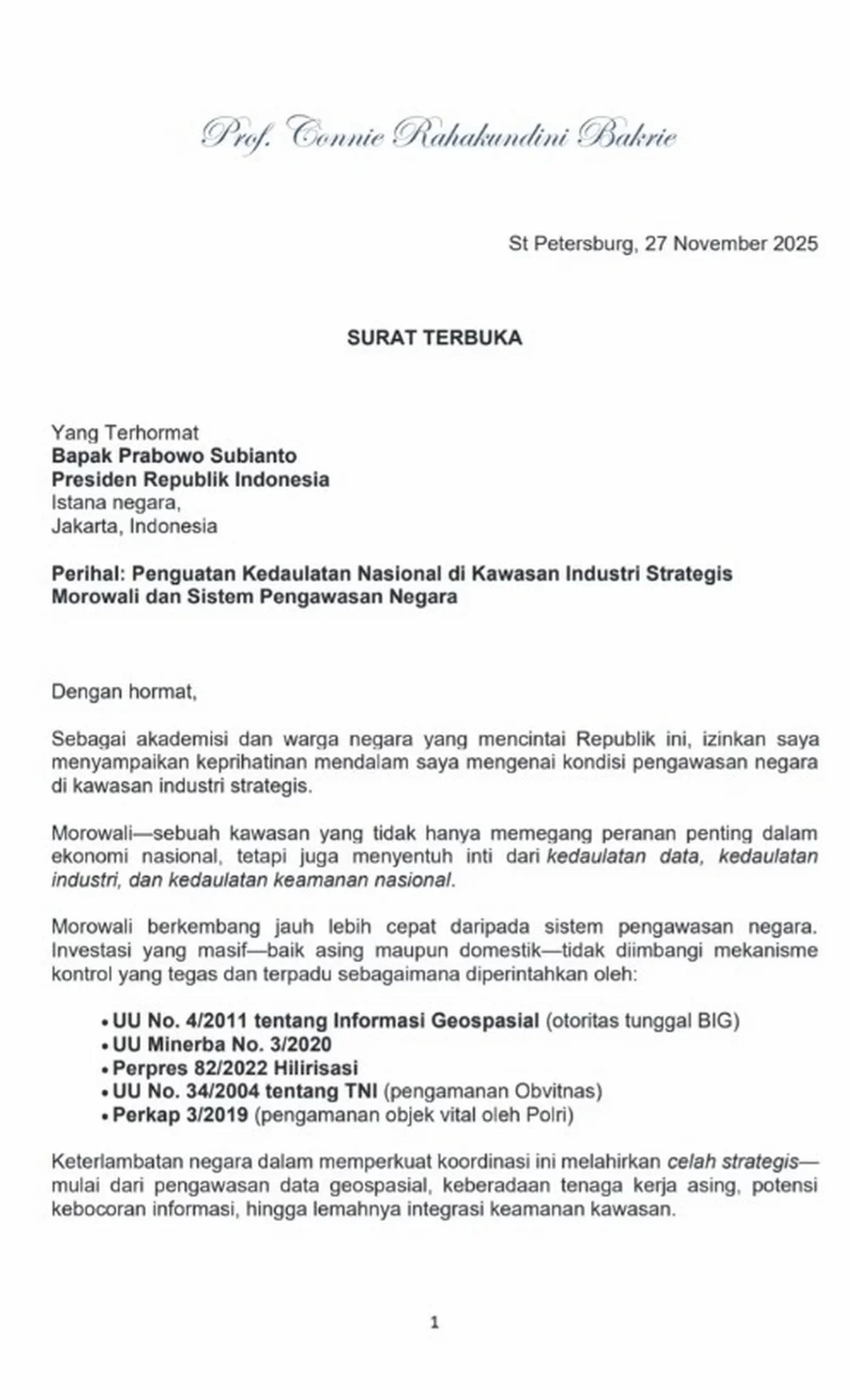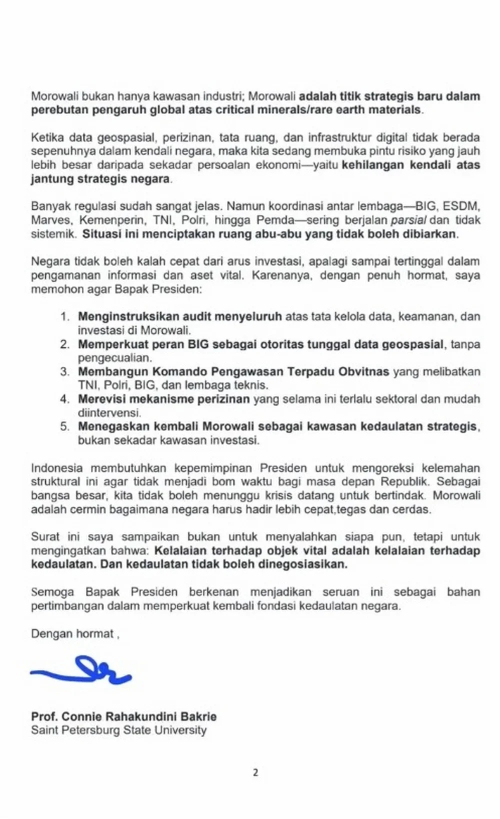 “Surat ini saya sampaikan bukan untuk menyalahkan siapa pun, tetapi untuk mengingatkan bahwa: Kelalaian terhadap objek vital adalah kelalaian terhadap kedaualatan,” ujar Connie.