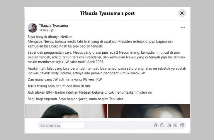 Sebelumnya pada Juli 2025, dokter Tifa pun sempat menuliskan tentang tahi lalat Jokowi yang berpindah tempat di akun Facebook miliknya.
