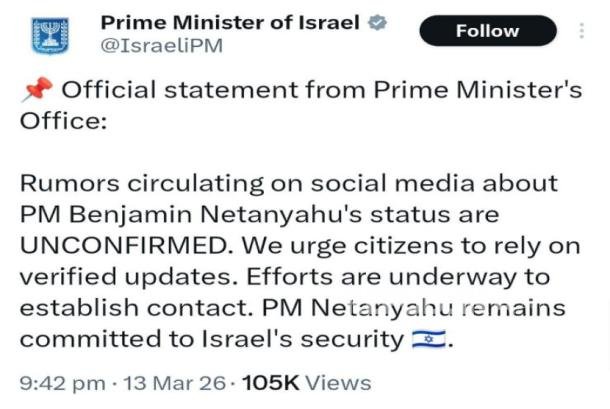 “Rumor yang beredar di media sosial mengenai kondisi Perdana Menteri Benjamin Netanyahu belum dapat dikonfirmasi. Kami mengimbau warga untuk mengandalkan informasi terbaru yang telah diverifikasi. Upaya untuk menjalin kontak sedang dilakukan. Perdana Menteri Netanyahu tetap berkomitmen terhadap keamanan Israel.”