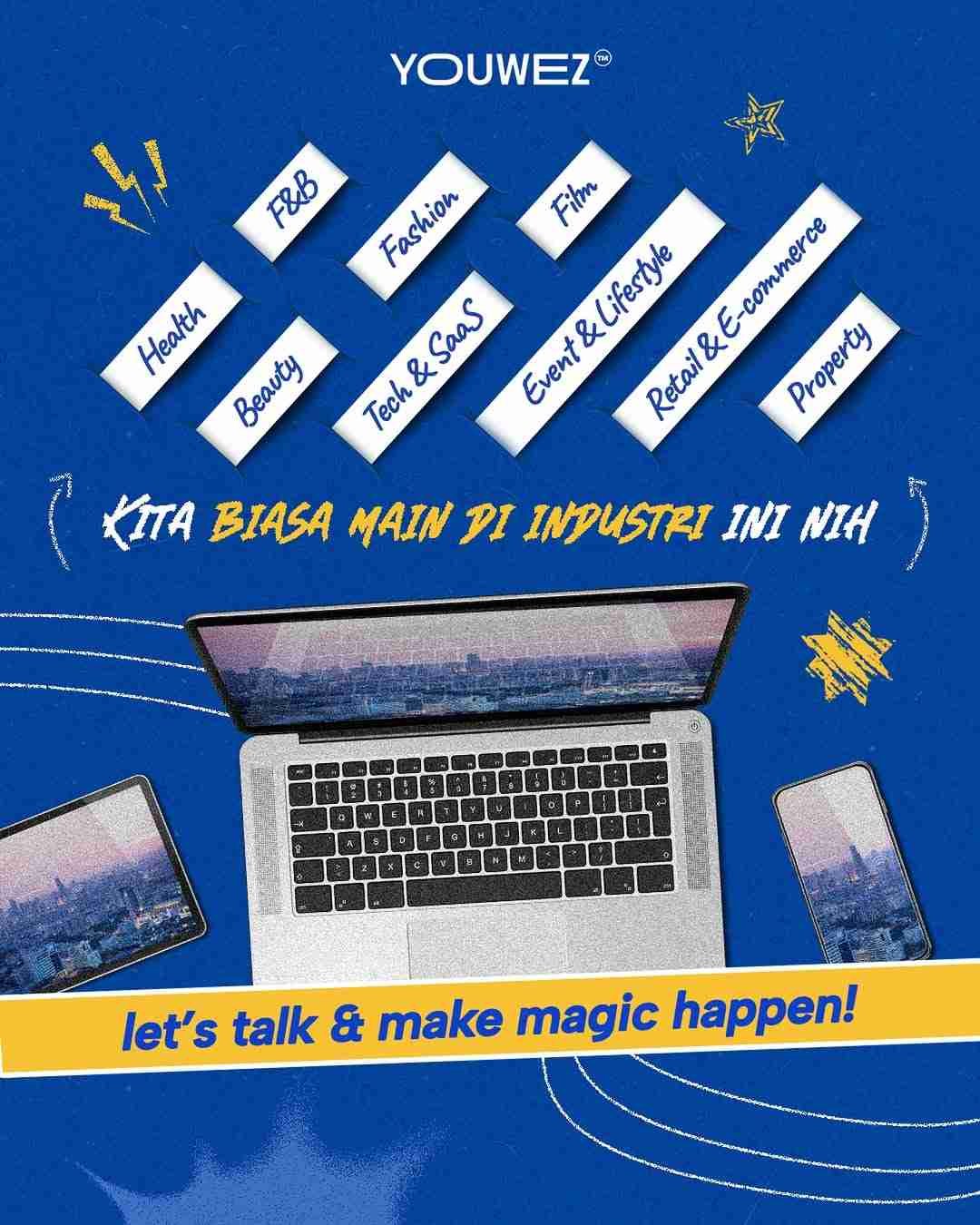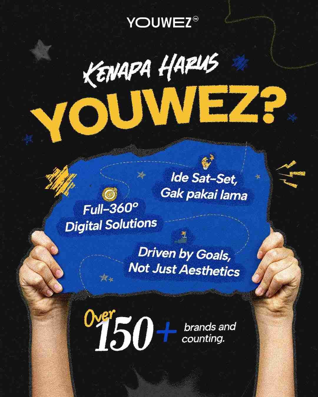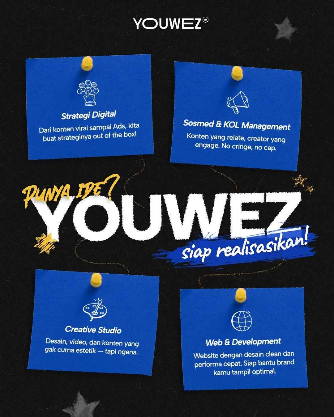 Youwez adalah creative agency Jakarta yang membantu brand membangun brand identity system end-to-end mulai dari strategi naratif, desain visual, pedoman verbal, hingga motion guideline agar komunikasi konsisten di semua kanal.