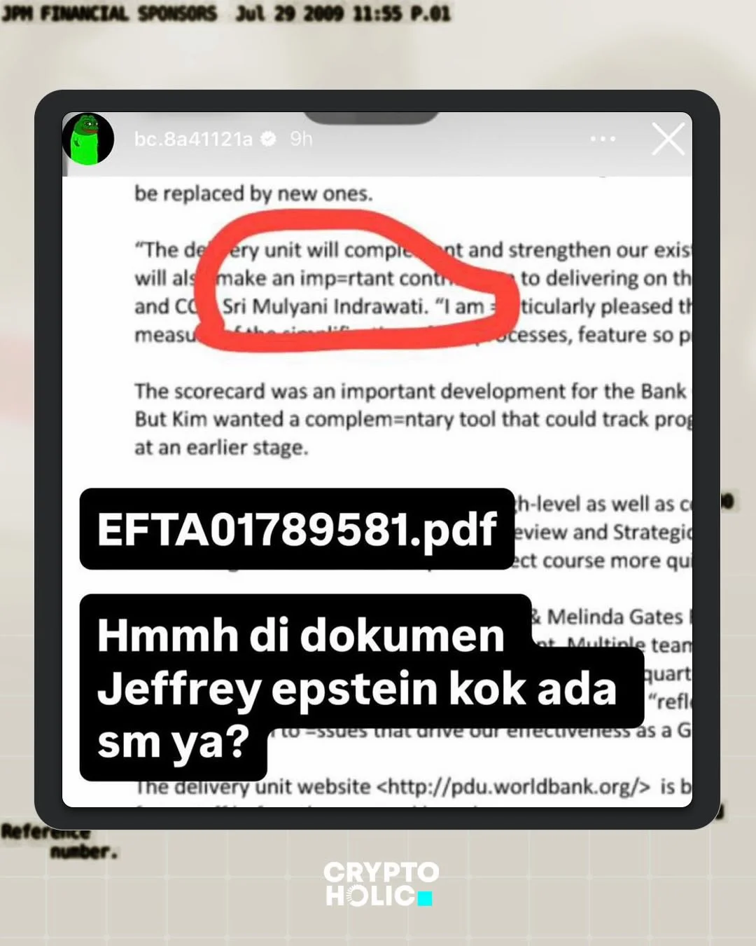 @cryptofrontier.id 🔥 Nama Sri Mulyani Indrawati muncul di dokumen Jeffrey Epstein — fakta, atau cuma potongan tanpa konteks? Baru baru ini Anak dari kemenkeu yakni Yudo Sadewa Mengupload Cerita instagram tentang munculnya nama Sri Mulyani Indrawati dalam file jeffrey epstein Tapi penting dicatat: 👉 Munculnya nama dalam dokumen tidak otomatis berarti terlibat kasus apa pun. 👉 Banyak dokumen Epstein berisi kontak, kutipan laporan, atau referensi kerja lintas institusi global. 👉 Sampai saat ini belum ada pernyataan resmi yang mengonfirmasi keterlibatan Sri Mulyani dalam perkara Epstein. Di era viral seperti sekarang, potongan PDF bisa cepat jadi narasi besar — padahal konteks adalah segalanya. Menurut kamu ini murni misleading context atau perlu investigasi lanjutan? Tulis pendapatmu di kolom komentar & follow untuk update global → dampaknya ke market. #jeffreyepstein #epstein #breakingnews #news #update ♬ suara asli – sxmldn