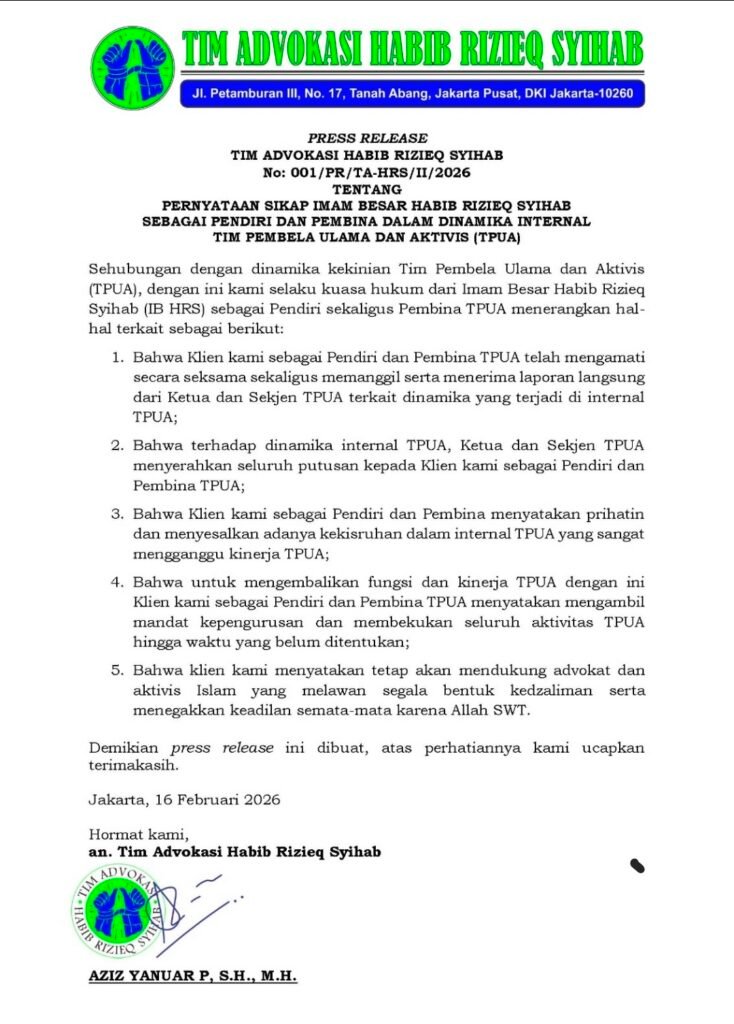 “Bahwa Klien kami sebagai Pendiri dan Pembina menyatakan prihatin dan menyesalkan adanya kekisruhan dalam internal TPUA yang sangat mengganggu kinerja TPUA,” kata Aziz dalam keterangan tertulisnya, Senin (16/2/2026).