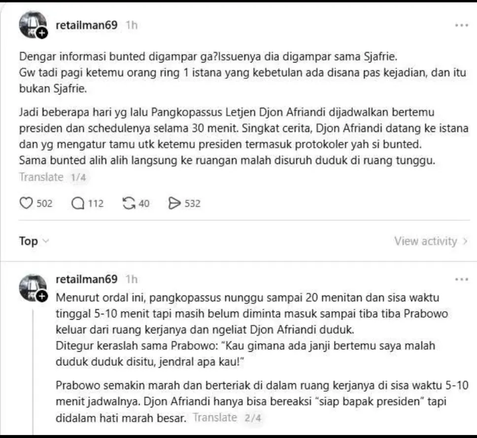 “Singkat cerita, Djon Afriandi datang ke istana, dan yang mengatur tamu untuk ketemu Presiden, termasuk protokoler, yah si bunted,” tulis keterangan di Threads, dikutip Minggu (19/4/2026).
