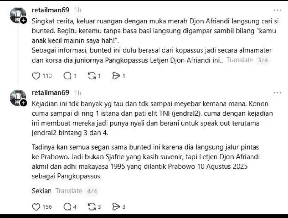 Dalam unggahan tersebut, ajudan yang disebut bunted dikatakan berasal dari Kopassus dan merupakan junior Djon Afriandi.