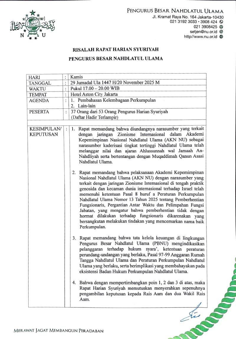 Dalam teks yang beredar, dituliskan bahwa rapat tersebut merupakan Risalah Rapat Harian Syuriah, Pengurus Besar Nahdlatul Ulama (PBNU) tertanggal Kamis, 29 Jumadil Ula 1447H / 20 November 2025M, pukul 17.00-20.00 WIB.