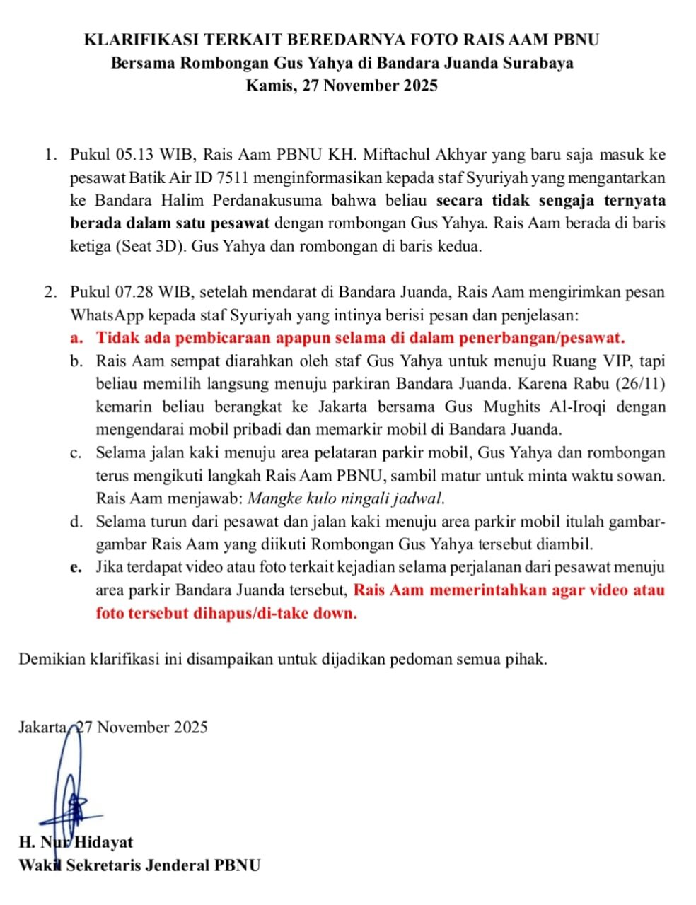 Permintaan tersebut disampaikan melalui klarifikasi resmi PBNU pada Kamis (27/11/2025), tidak lama setelah sejumlah potongan video dan foto tersebar luas di media sosial.