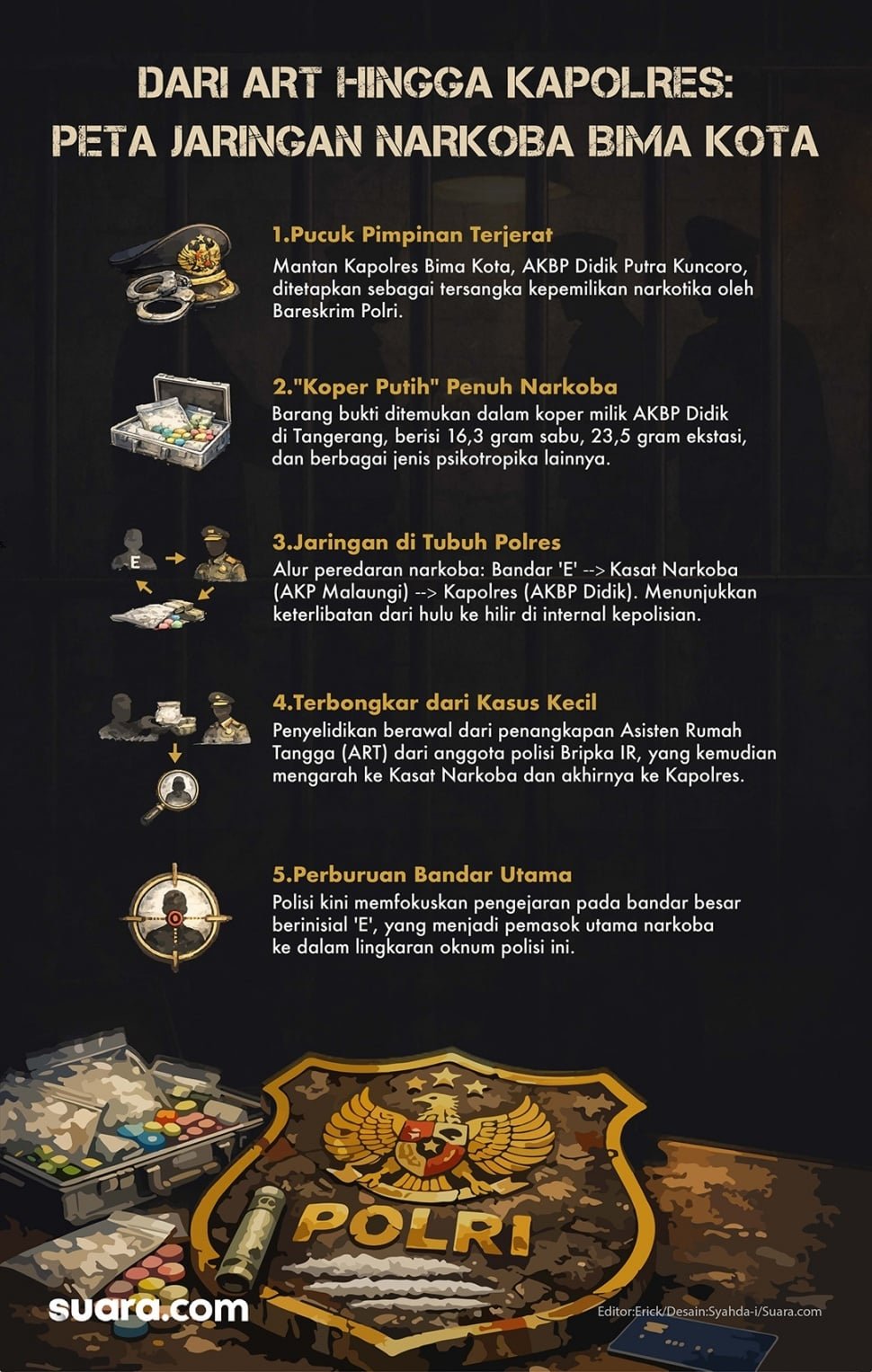 Pemeriksaan mendalam akhirnya memetakan alur distribusi barang haram yang melibatkan sejumlah personel internal Polres Bima Kota. Pemasok utamanya adalah seorang bandar berinisial E.