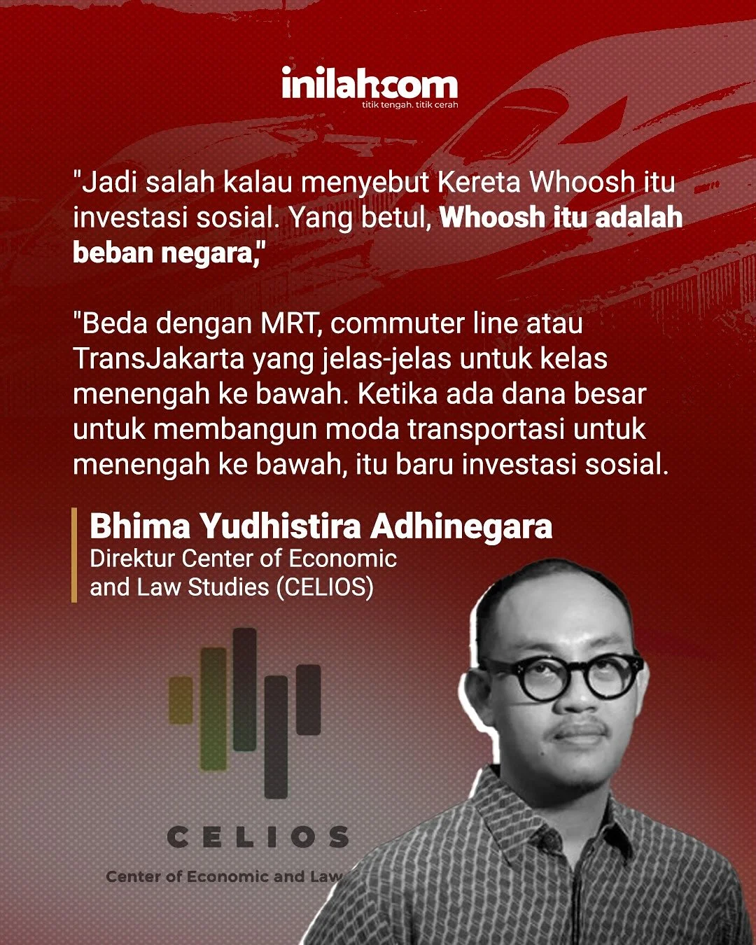 Hal senada disampaikan Direktur Center of Economic and Law Studies (CELIOS), Bhima Yudhistira Adhinegara yang membantah pernyataan mantan Presiden Jokowi yang menyebut proyek Kereta Cepat Jakarta-Bandung (KCJB) atau Kereta Whoosh adalah investasi sosial.