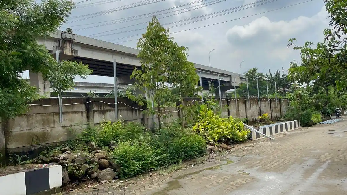 Dinding tembok itu berbatasan langsung dengan lahan kosong bersemak serta akses terbuka Tol Becakayu dan Jalan Raya Kalimalang.