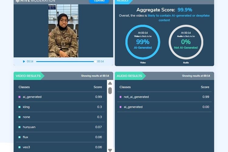 Setelah dicek menggunakan Hive Moderation, video itu terdeteksi dihasilkan AI.