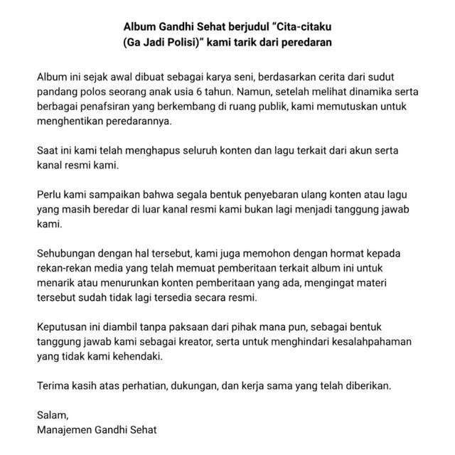 Dalam klarifikasi yang diunggah, pada Jumat, 13 Februari 2026, manajemen Gandhi Sehat membenarkan, extended play Cita-Citaku (Ga Jadi Polisi) ditarik dari peredaran.