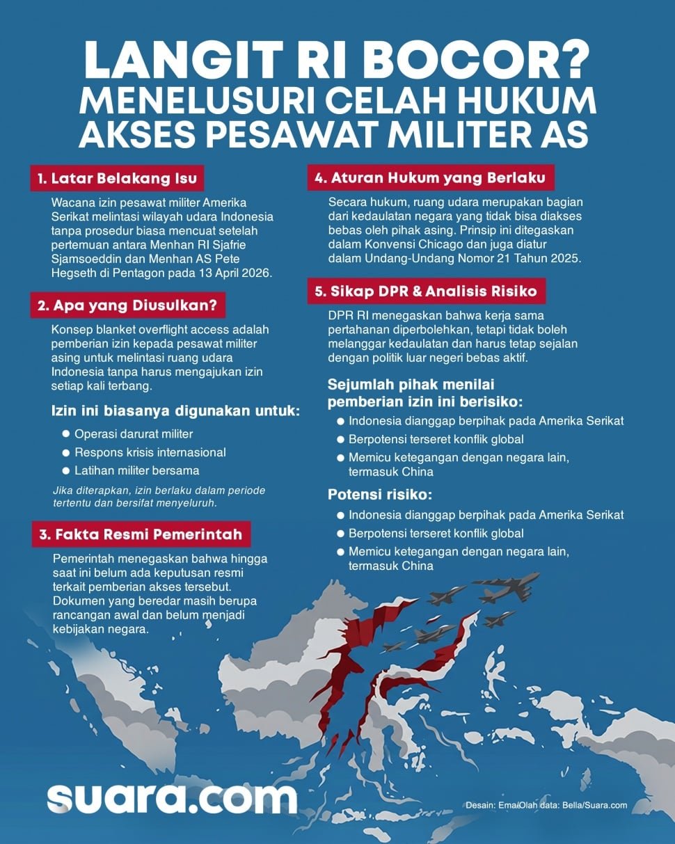 Kabar ini menjadi buah bibir lebih dulu setelah sebuah dokumen pertahanan Amerika Serikat yang bersifat rahasia baru-baru ini mengungkap rencana strategis Washington untuk mengamankan akses lintasan udara menyeluruh (blanket overflight access) bagi pesawat militer mereka di wilayah kedaulatan Indonesia.
