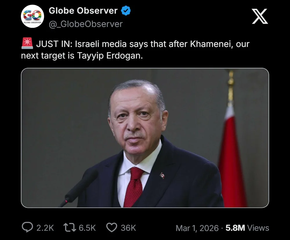 DEMOCRAZY.ID – Berdasarkan laporan media per 1 Maret 2026, terdapat klaim yang sangat provokatif dari beberapa outlet media Israel dan media sosial yang menyatakan bahwa Presiden Turki Recep Tayyip Erdogan adalah target strategis berikutnya bagi Israel setelah kematian Pemimpin Agung Iran Ayatollah Ali Khamenei.