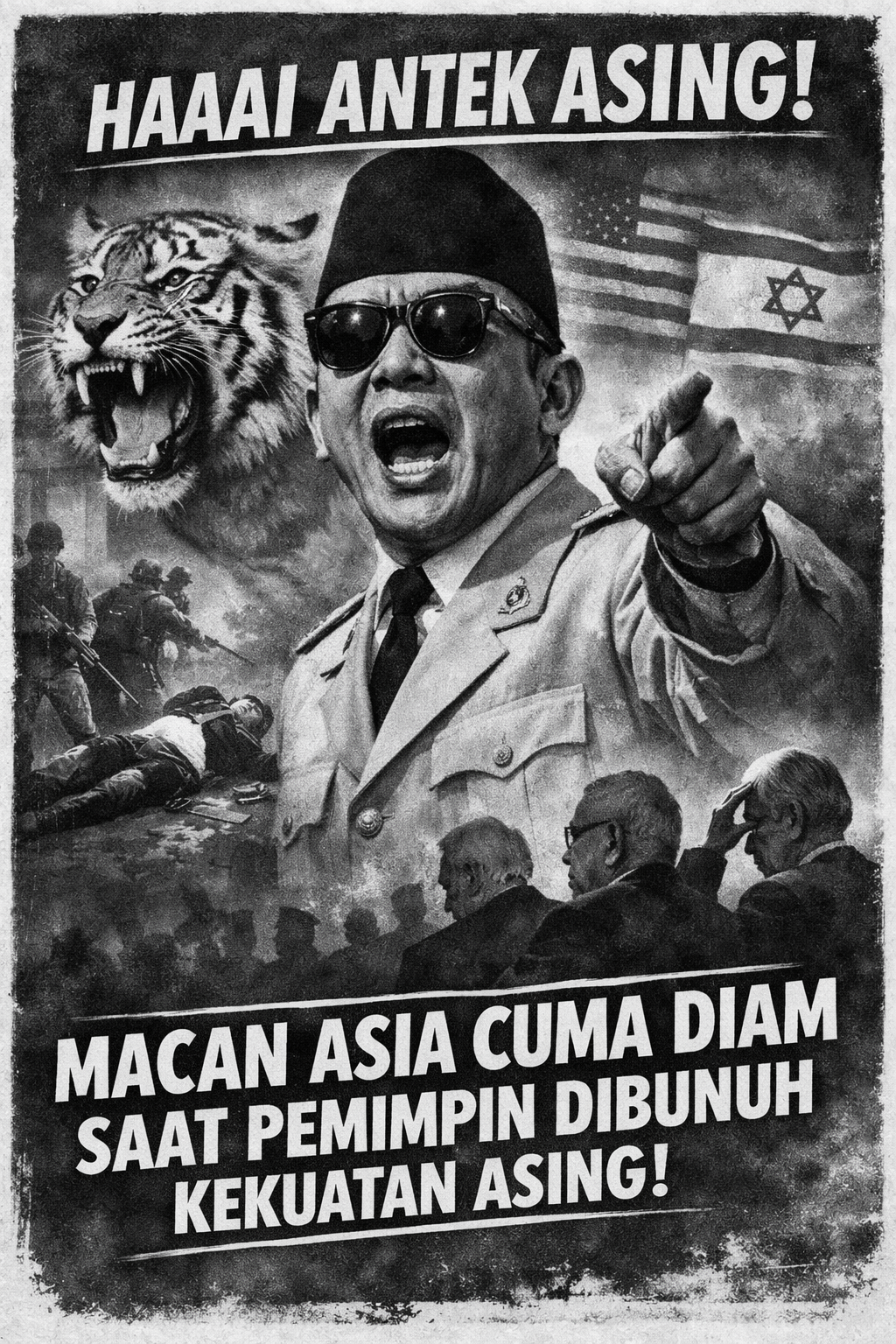 Dalam unggahannya, akun tersebut menggunakan gaya retoris yang disebut-sebut “ala-ala Soekarno”, lengkap dengan julukan “Macan Asia” dan seruan khas, “Haaai Antek Asing!”