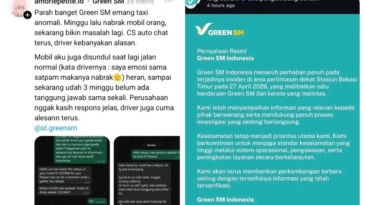 “Green SM Indonesia menaruh perhatian penuh pada terjadinya insiden di area perlintasan dekat Stasiun Bekasi Timur pada 27 April 2026, yang melibatkan satu kendaraan Green SM dan kereta yang melintas.