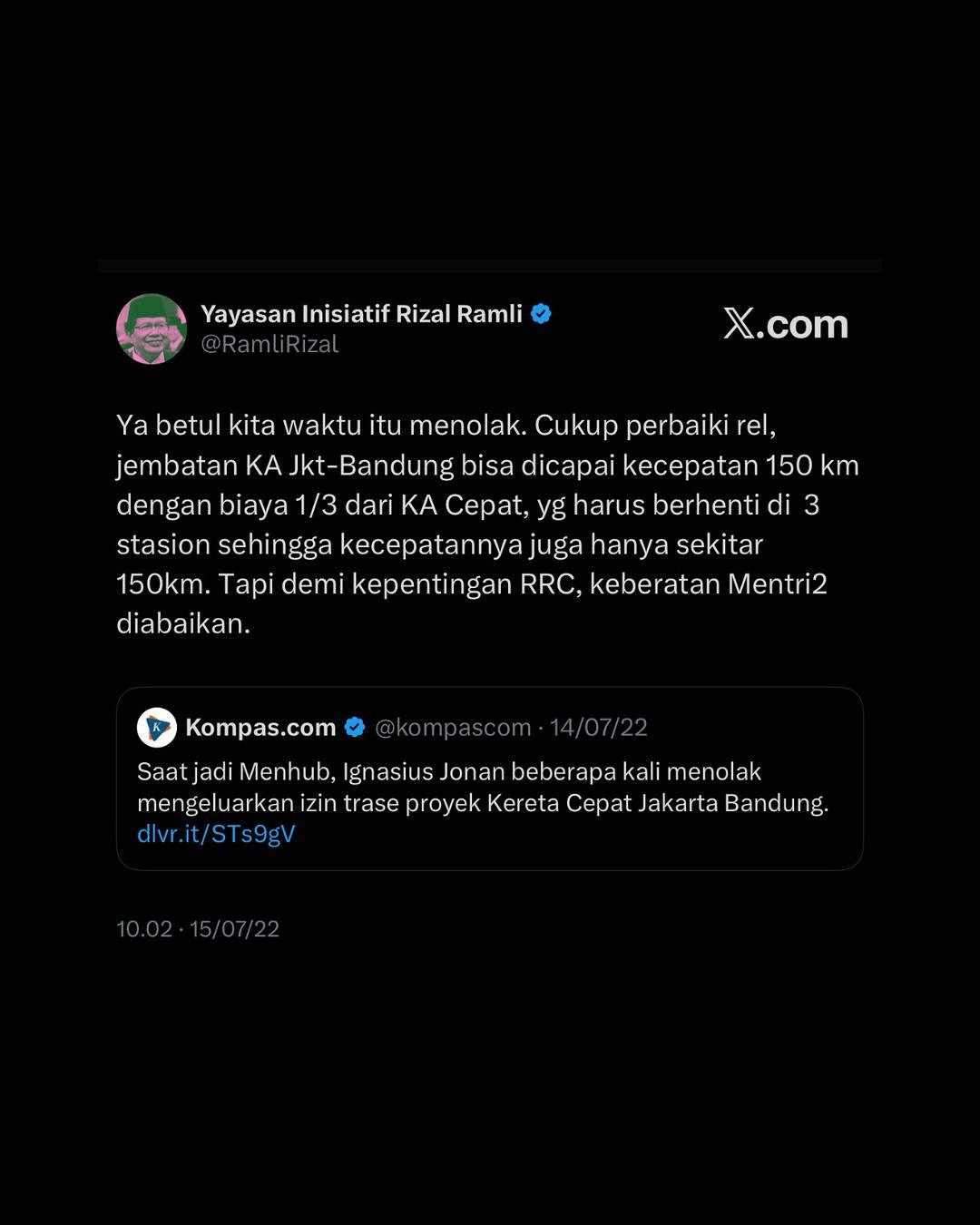 Lewat cuitan di akun media sosial X pribadinya, Mantan Menkeu itu menyebut awalnya ada penolakan soal proyek kereta cepat ini.
