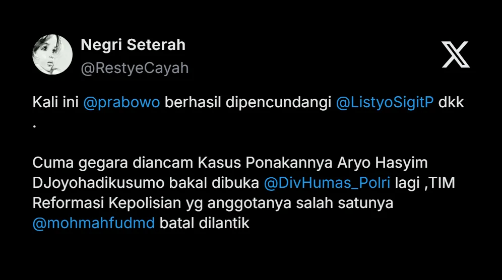 “Kali ini @prabowo berhasil dipencundangi @ListyoSigitP dkk. Cuma gegara diancam Kasus Ponakannya (Aryo Hasyim DJoyohadikusumo) bakal dibuka @DivHumas_Polri lagi,TIM Reformasi Kepolisian yg anggotanya salah satunya @mohmahfudmd batal dilantik,” cuit akun X @RestyeCayah.