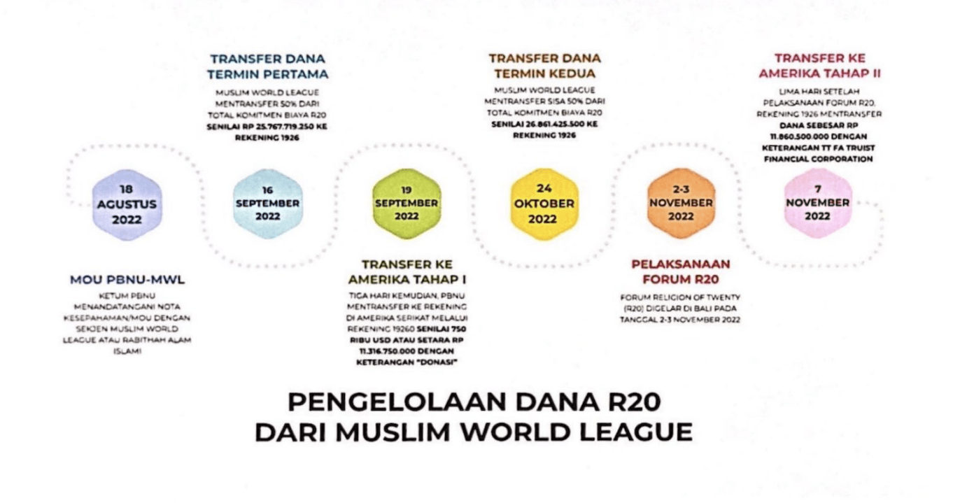 “Rabithah Alam Islami memberikan dukungan dana untuk biaya penyelenggaraan R20 sebesar Rp 52.629.144.750,-. Dana sejumlah tersebut ditransfer dalam dua termin, masing-masing sebesar Rp 25.767.719.250,- pada 16 September 2022 dan Rp 26.861.425.500,- pada 24 Oktober 2022,” tulis audit dalam dokumen yang dikutip pada Jumat (28/11/2025).