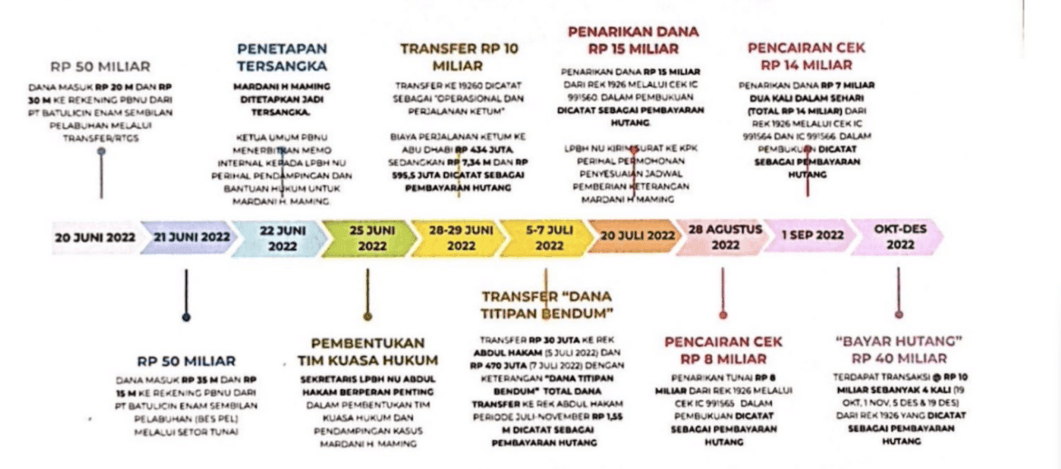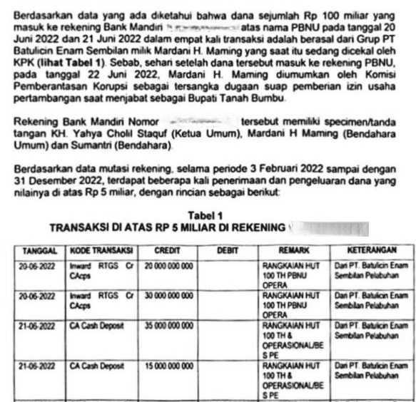 “Berdasarkan data yang ada diketahui bahwa dana sejumlah Rp 100 miliar yang masuk ke rekening Bank Mandiri atas nama PBNU pada tanggal 20 Juni 2022 dan 21 Juni 2022 dalam empat kali transaksi adalah berasal dari Grup PT Batulicin Enam Sembilan milik Mardani H. Maming,” tulis dokumen tersebut, dikutip Rabu (26/11/2025).