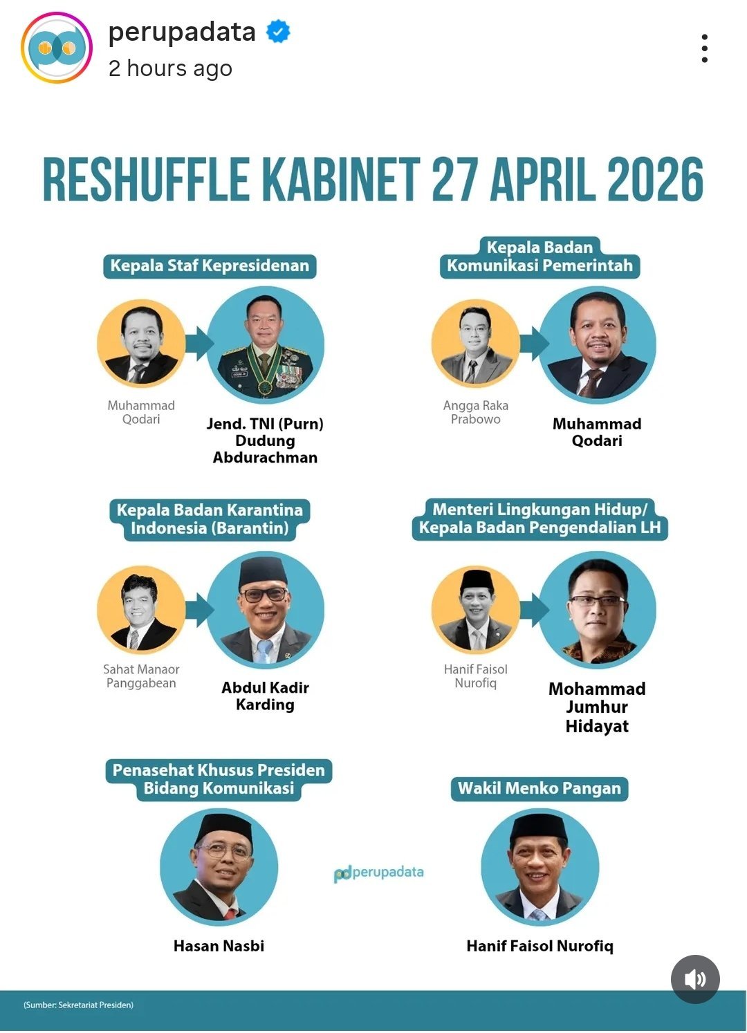 DEMOCRAZY.ID – Presiden Prabowo Subianto melantik pejabat menteri dan pejabat setingkat menteri dalam reshuffle kabinet di Istana Negara, Jakarta, Senin (27/4/2026).