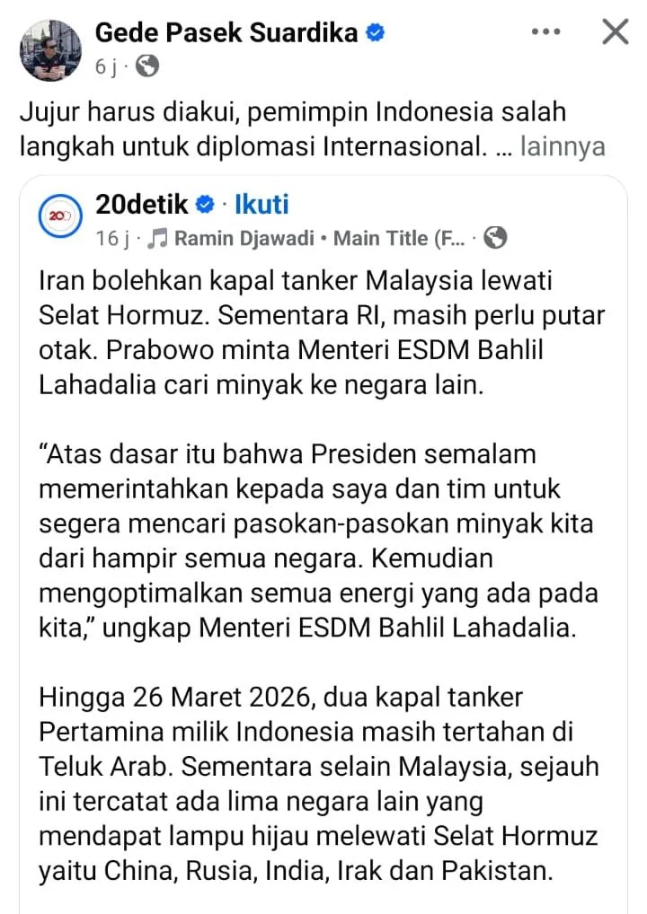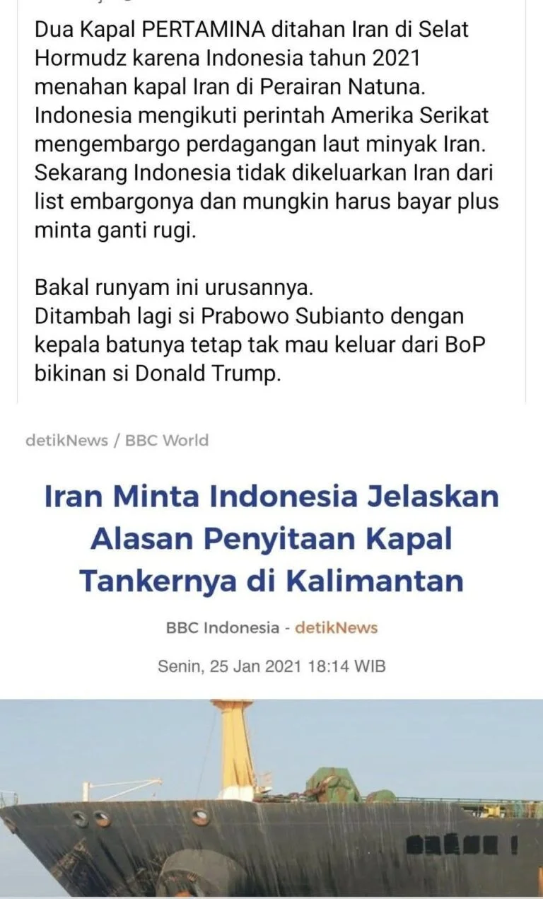 Iran bolehkan kapal tanker Malaysia lewati Selat Hormuz. Sementara RI, masih perlu putar otak. Prabowo minta Menteri ESDM Bahlil Lahadalia cari minyak ke negara lain.