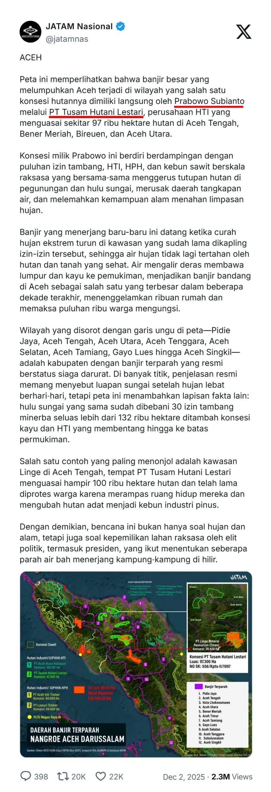 Jaringan Advokasi Tambang (JATAM) Nasional secara spesifik menuding banjir besar di Aceh, khususnya di Aceh Tengah terjadi di wilayah yang di dalamnya terdapat salah satu konsesi HTI milik PT Tusam Hutani Lestari (PT THL), perusahaan yang diakui Prabowo kepemilikannya.