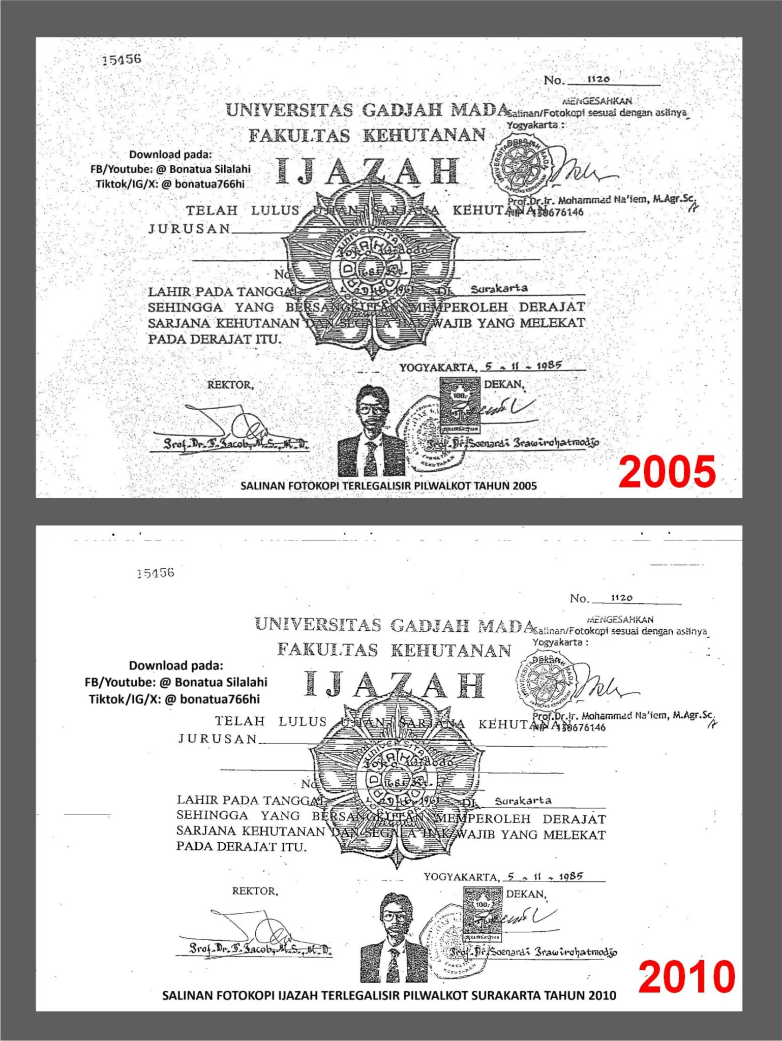 3. Meski tahun 2005 Prof Dr Ir Mohammad Naiem menurut Catatan UGM sudah jadi Dekan FKT UGM (semenjak 2004) tapi SEHARUSNYA ada 2 (dua) COPY LEGALISIR yang berbeda POSISI Cap dan Tandatangannya oleh Beliau untuk Tahun yang BERBEDA (2005 dan 2010) karena proses Legalisasinya juga berbeda.