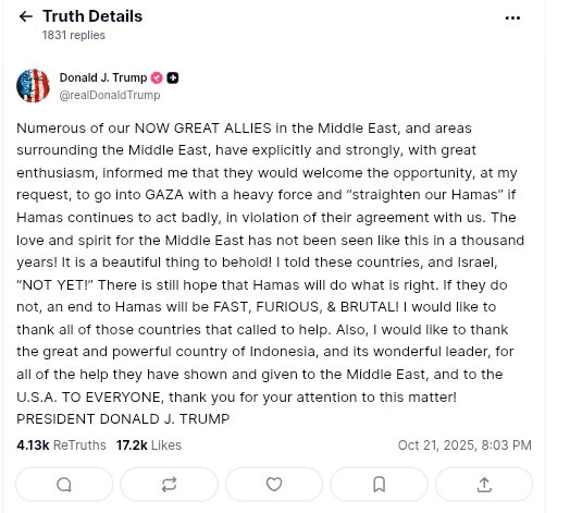 “Banyak sekutu besar kami yang sekarang di Timur Tengah, dan daerah sekitar Timur Tengah, secara eksplisit dan kuat, dengan antusiasme yang besar, memberitahu saya bahwa mereka akan menyambut baik kesempatan, atas permintaan saya, untuk memasuki Gaza dengan kekuatan besar dan “meluruskan Hamas kita” jika Hamas terus bertindak buruk, yang melanggar perjanjian mereka dengan kita,” ujar Trump, Selasa malam.