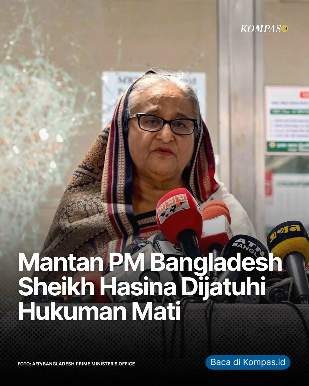 DEMOCRAZY.ID – Pengadilan Bangladesh menjatuhkan hukuman mati kepada mantan Perdana Menteri (PM) Sheikh Hasina setelah menyatakannya bersalah atas kejahatan terhadap kemanusiaan.