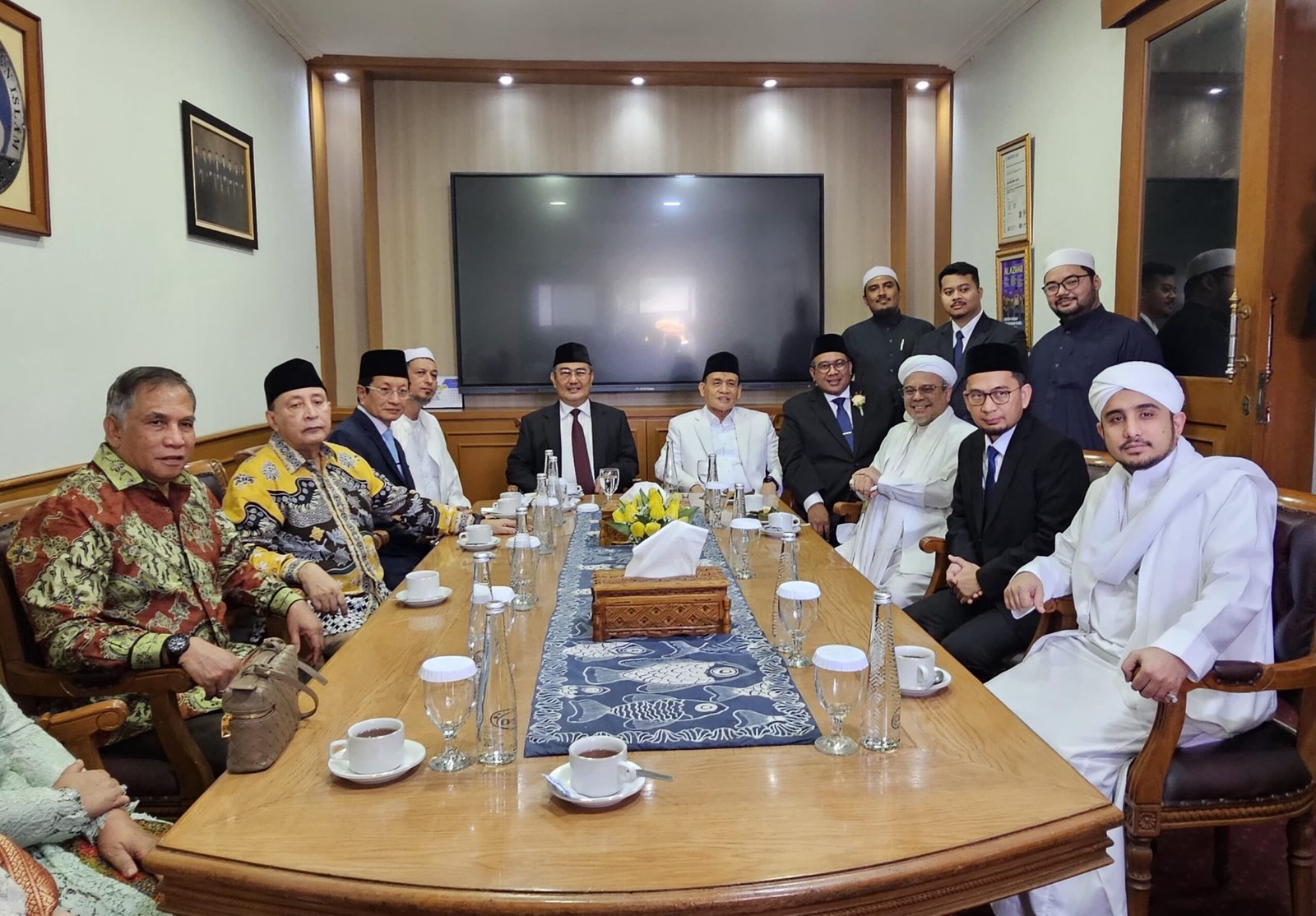 Wajah keduanya tampak teduh, dikelilingi para tokoh agama yang memancarkan suasana kekeluargaan dan keberkahan.